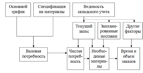 2) Функциональная область логистики «производство» Цель функциональной области «производство» – обеспечение логистической поддержки управления производственными процедурами. Задачи: · Оперативно-календарное планирование выпуска готовой продукции (ГП); · Оперативное управление технологическими процессами производства; · Всеобщий контроль качества, поддержание стандартов и соответствующего сервиса; · Стратегическое и оперативное планирование поставок материальных ресурсов (МР); · Организация внутрипроизводственного складского хозяйства; · Прогнозирование, планирование и нормирование расходов МР в производстве; · Организация работы внутрипроизводственного технологического транспорта; · Управление запасами МР, незавершенного производства (НП), ГП на всех уровнях; · Физическое распределение МР и ГП (внутрипроизводственное) и др. Существует два типа производственных логистических систем: толкающего (выталкивающего) типа и тянущего (вытягивающего) типа. Толкающие системы характеризуются следующим: время выполнения каждой операции устанавливается общим расписанием, к этому времени операция должна быть завершена; Полученный продукт далее «проталкивается» дальше и становится запасом НП в начале следующей операции. Этот вариант игнорирует то, что в настоящее время делает следующий участок, а он может быть занят или ожидать поступления НП. Результатом становятся задержки в работе и рост запасов незавершенного производства. Вытягивающие системы характеризуются следующим: когда в ходе одной операции заканчивается обработка единицы продукции, посылается сигнал на предыдущую операцию и сообщается, что требуется другая единица для работы. Другими словами, предыдущая операция отправляет обрабатываемую единицу только тогда, когда получает на это запрос. Системы выталкивающего типа основываются на строгом графике производства и дают возможность применения систем планирования ресурсов (MRP – I, МRP – II). Планирование осуществляется на основе следующих источников информации (рис.4.2): - основного графика, где указывается объем каждого продукта, изготавливается в каждый промежуток времени; - ведомость спецификации материалов, где перечисляются материалы, необходимые для производства каждого вида продукции; - учетная документация по запасам, где показано наличие материалов.