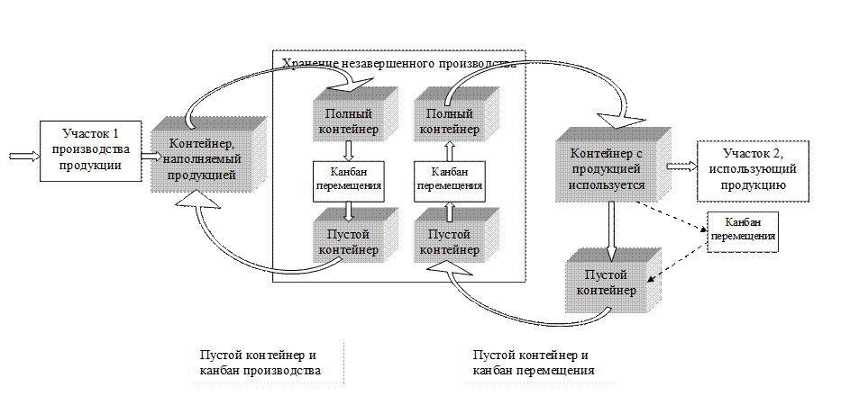 Вытягивающие системы работают в соответствии с концепциями точно-в-срок и быстрой реакции на запросы потребителей. Примером вытягивающих систем является система КАНБАН, рис.4.3. Условия функционирования системы КАНБАН: 1) Все материалы хранятся и перемещаются в стандартных контейнерах, для каждого материала используется свой контейнер. 2) Контейнер перемещается только тогда, когда к нему прикрепляется канбан перемещения. 3) Когда одни участок нуждается в материалах (запас НЗП до уровня повторного заказа), к пустому контейнеру прикрепляется канбан перемещения. Это сигнал для отправления контейнера на предыдущий участок или участок хранения НЗП. На этом участке к контейнеру прикрепляется канбан производства, и конейнер передается на предыдущий участок.