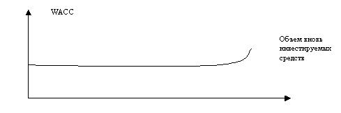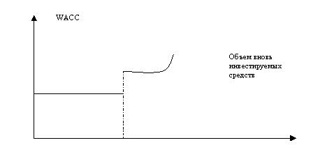 Каждый из источников предпринимательского капитала имеет разную стоимость. Предельная стоимость капитала показывает на предельные затраты предпринимателя. Одной из ключевых категорий в экономике является понятие предельных (маржинальных) затрат, под которыми понимают затраты на производство очередной единицы продукции. Наращивание экономического потенциала может осуществляться как за счет собственных, так и за счет привлеченных средств. Второй источник в принципе не ограничен сверху, но стоимость его может меняться в зависимости от структуры авансированного капитала. Относительный рост в динамике второго источника, как правило, приводит к возрастанию стоимости капитала в целом как платы за возрастающий риск. В связи с этим вводится понятие предельной (маржинальной) стоимости капитала (МСС). Если предприниматель планирует участие в крупном инвестиционном проекте, то для его реализации потребуются дополнительные источники финансирования. Получить он их может, например, на фондовом рынке. В этом случае прогнозная стоимость капитала, являющаяся предельной, может существенно отличаться от текущей стоимости. Условно можно считать, что в стабильно действующей коммерческой организации со сложившейся системой финансирования своей деятельности средневзвешенная стоимость капитала (WАСС) остается постоянной при некотором варьировании объема вовлекаемых в ходе инвестирования ресурсов, однако по достижении определенного предела она возрастает. Таким образом, предельная стоимость капитала является функцией объема вовлекаемых финансовых ресурсов (рисунок 4).