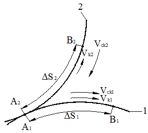 Через некоторое время Dt точка контакта переместится по первому профилю на расстояние DS1, а по второму – DS2 (ÈA1B1=DS1, ÈA2B2=DS2). Если пути, пройденные точкой контакта по обоим профилям одинаковы DS1 = DS2, то скольжение профилей отсутствует. В этом случае профили перекатываются друг по другу без скольжения. Если пути, пройденные точкой контакта за одно и то же время Dt не одинаковы DS1 ¹ DS2, то существует скольжение профилей друг по другу. Предположим, что перемещение точки контакта по первому профилю больше чем по второму DS1 > DS2. Тогда DS1–DS2 есть величина проскальзывания точки контакта по первому профилю, a DS2–DS1 – величина проскальзывания точки контакта по второму профилю. Величина скольжения по первому профилю (DS1–DS2) – положительная, а по второму (DS2–DS1) – отрицательная величина. По модулю величины проскальзывания по первому и второму профилю одинаковые: ïDS1–DS2ï=ïDS2–DS1ï. Обозначим скорость перемещения точки контакта по первому профилю Vk1, по второму – Vk2, а скорости скольжения соответственно Vсk1 и Vсk2. Скорости перемещения совпадают с направлением перемещения точки контакта. Скорости скольжения Vсk1 и Vсk2 будут совпадать с направлением скольжения профилей. Поскольку DS1–DS2 – величина положительная, то направление скорости скольжения Vck1 совпадает с направлением перемещения точки контакта Vk1. Величина проскальзывания точки контакта по второму профилю DS2–DS1 отрицательна, поэтому и направление скорости скольжения Vck2 не совпадает со скоростью перемещения точки контакта Vk2. Определим скорость скольжения точки контакта по первому профилю. Средняя скорость скольжения по первому профилю есть путь скольжения точки контакта по первому профилю, деленный на время скольжения – время перемещения точки контакта: