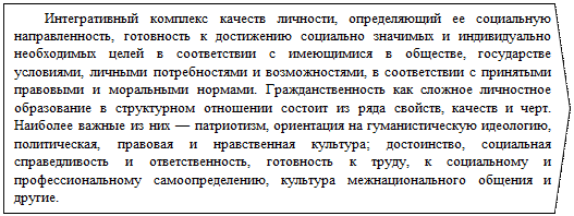 Введение школьников в систему общественных отношений есть процесс воспитания у них культуры отношений к своему народу (нации) и другим народам (нациям), к своей малой родине, стране, государству и обществу в целом. Результатом такого воспитания, а также самоопределения учащихся в социальной сфере будет их гражданская культура. Гражданская культура – интегративное качество личности, характеризующее степень овладения ею общечеловеческими гуманистическими ценностями, культурными и духовными традициями белорусского народа и идеологией белорусского государства, сформированности готовности личности к исполнению гражданского долга. Основу гражданской культуры личности составляет ее гражданственность. Гражданственность может рассматриваться (по А. В. Беляеву) в социально-правовом, морально-этическом, социально-психологическом, педагогическом, социально-педагогическом аспектах (см. схему 60). Итак, гражданственность — качество, характеризующее человека как сознательного и активного гражданина. Это качество выражается в знании гражданских прав и обязанностей, готовности трудиться на общую пользу, решимости и умении отстаивать общественные интересы, в выполнении гражданского долга, непримиримости к антигосударственным проявлениям, умении сочетать личные интересы с общественными (по Л.А. Козинец, Е.Ю. Крикало). Схема 60