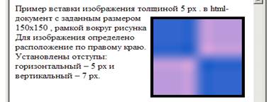 <p> Пример вставки изображения толщиной 5 рх. <IMG SRC="/images/square.gif " ALT="Квадрат" TITLE =" Пример использования изображения" ALIGN="right" BORDER ="5" WIDTH="150" HEIGHT="150" HSPACE="5" VSPACE="7" > в html-документ с заданным размером 150х150, рамкой вокруг рисунка Для изображения определено расположение по правому краю. Установлены отступы: горизонтальный – 5 рх и вертикальный – 7 рх. </p>