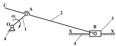 Кинематический расчёт кривошипно-ползунного механизма. Определение скоростей точек звеньев для заданного положения механизма. Дано: 1.Угловая скорость кривошипа является постоянной и равна 2.Размеры звеньев: ОА = 20мм, АВ = 76мм, АС = 26мм.