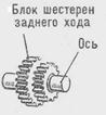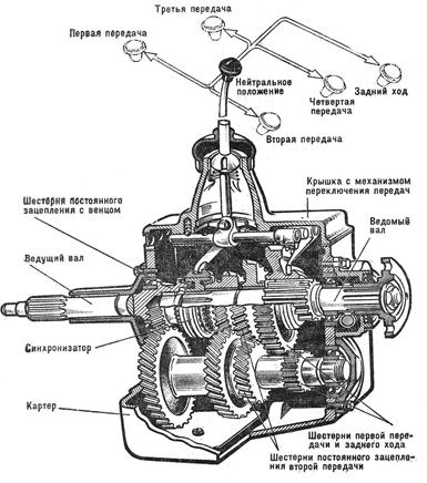 Решение: Данная коробка передач имеет 4 передачи для движения вперед и одну передачу заднего хода. В постоянном зацеплении находятся шестерня ведущего и промежуточного валов, шестерни 2 и 3 передач промежуточного и ведомого валов. Первая передача (рис.6.4,а) включается перемещением шестерни первой передачи ведомого вала назад до зацепления с шестерней первой передачи промежуточного вала. Вторая передача (рис.6.4,б) включается перемещением шестерни первой передачи ведомого вала вперед до зацепления с шестерней постоянного зацепления второй передачи промежуточного вала. Третья передача (рис.6.4,в) включается перемещением муфты синхронизатора назад. Зубья муфты входят в зацепление с венцом шестерни постоянного зацепления третьей передачи, закрепляя ее на ведомом валу. Четвертая передача (рис.6.4,г) включается перемещением муфты синхронизатора вперед, ее зубья входят в зацепление с венцом ведущего вала, Рис.6.3 соединяя ведущий и ведомый валы. Промежуточный вал в передаче крутящего момента не участвует. Задний ход (рис.6.4, г) включается перемещением блока шестерен заднего хода на оси до ввода в зацепление с шестернями первой передачи промежуточного и ведомого валов.