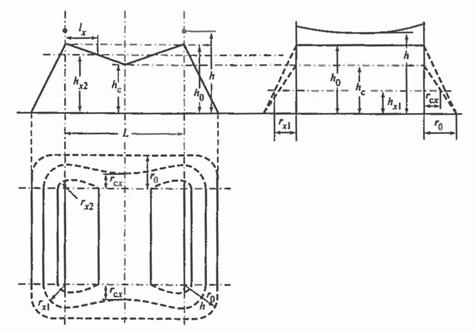 Молниеотвод считается двойным тросовым, когда расстояние между тросами L не превышает предельного значения Конфигурация вертикальных и горизонтальных сечений стандартных зон защиты двойного тросового молниеотвода (высотой h и расстоянием между тросами L) представлена на рис. 9.23. Построение внешних областей зон (двух односкатных поверхнос тей с размерами Размеры внутренних областей определяются максимальной высотой зоны