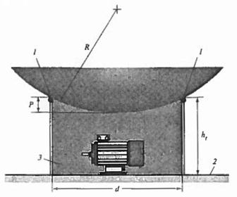 Рис. 9.33. Пример выполнения системы молниезащиты стержневыми молниеотводами, установленными на защищаемом объекте: 1 – стержневые молниеотводы; 2 – защищаемый объект; 3 – базовая плоскость;