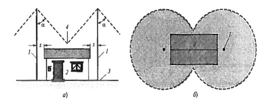 Рис. 9.32. Система молниезащиты с двумя отдельно стоящими молниеотводами и зона защиты, определенная с помощью метола защитного угла: а — вертикальная проекция; б — горизонтальная проекция; 1 — мачта молниеотвода; 2 — защищаемый объект, 3 — земля (базовая поверхность); 4 - пересечение защитных зон; s — наименьшее расстояние между молниеотводом и защищаемым объектом;