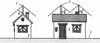Рис. 9.36. К определению защитных углов для объектов с расположенными на крыше молниеприемниками