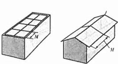 Молниеприемники, горизонтально установленные над проводящей крышей, показаны на рис. 9.37. В этом случае катящаяся сфера радиусом R должна быть выше выступов на крыше (превышение обозначено буквой а). Молниеотвод в виде горизонтального проводника установленного вышеконька крыши, показан на рис. 9.38. Защищаемый объект должен полностью находиться в защитной зоне, определяемой защитным углом. Примеры молниеприемников в виде сеток, устанавливаемых на крышах, приведены на рис. 9.39 и 9.40. Размер ячейки М выбирается по табл. 9.8 в зависимости от