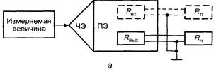 Структурная схема измерительного преобразователя, включающая в себя элементы, общие для всех типов преобразователей, представлена на рис. 13, а. Элементы рисунка, обозначенные пунктирными линиями (входное сопротивление В таком представлении измерительный преобразователь можно рассматривать как совокупность чувствительного элемента (ЧЭ) и преобразующего элемента (ПЭ). Чувствительный элемент воспринимает измеряемую величину и преобразует ее в другую физическую величину. Далее промежуточный измерительный преобразователь (преобразующий элемент) преобразует физическую величину в электрический сигнал, который отражает значение измеряемой величины.