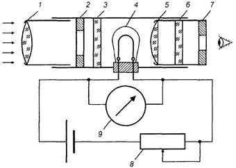 Рис. 76. Яркостями пирометр с «исчезающей» нитью накаливания: / — объектив; 2, 7— диафрагмы; 3, 6— фильтры; 4— пирометрическая лампа; 5 — окуляр; 8 — реостат; 9 — измерительный прибор