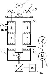 где прохождения слоя поглощающего газа; Для измерения интенсивности излучения, прошедшего слой анализируемого газа, используют оптико-акустический эффект: газ, способный поглощать ИК-лучи, в замкнутом объеме подвергается прерывистому воздействию инфракрасного излучения, при этом смесь периодически нагревается (в результате поглощения излучения) и охлаждается (при прекращении излучения). Колебания температуры вызывают колебания давления газа, воспринимаемые звуковым приемником. Принципиальная схема двухканального оптико-акустического газоанализатора показана на рис. 110. От двух источников (излучателей) 3 с отражателями 2 потоки инфракрасного излучения, практически одновременно прерываемые обтюратором 4 (вращается электродвигателем У) с определенной частотой, проходят две камеры 5 и 6, затем фильтровые камеры 7 и попадают в лучеприемник 8. Сравнительная непроточная камера 6 заполнена азотом, а в рабочую Камеру 5 поступает анализируемый газ. Окна рабочей, сравнительной и фильтровых камер, а также лучеприемника выполнены из материала, пропускающего ИК-излучение. Фильтровые камеры заполняются неопределяемыми мешающими газами, спектры поглощения которых могут частично перекрывать спектр поглощения определяемого компонента. Таким образом присутствие в анализируемой смеси мешающих газов не будет приводить к увеличению погрешности измерения, так как они будут поглощать ИК-излучение в характерных для них участках спектра в обоих каналах — как измерительном, так и сравнительном, и разность интенсивности потоков ИК-излучения, поступающего в левую и правую камеры лучеприемника, будет зависеть от концентрацией в анализируемой смеси только определяемого компонента. Лучеприемник 8 состоит из двух камер, разделенных конденсаторным микрофоном 9 и заполненных смесью азота с определяемым компонентом. Периодически газ в лучеприемнике 8 нагревается (за счет поглощения энергии) и охлаждается, что приводит к возникновению в замкнутом объеме лучеприемника периодических колебаний температуры, вызывающих периодические колебания давления газа. При равенстве интенсивностей инфракрасного излучения в правой и левой частях лучеприемника 8 мембрана конденсаторного микрофона неподвижна. Если интенсивность поступающего инфракрасного излучения в левую лучеприемную камеру будет меньше, чем в правую, то и амплитуда периодического колебания давлений в левой лучеприемной камере будет меньше, чем в правой. При этом разность давлений, действующая на мембрану конденсаторного микрофона, будет тем больше, чем больше будет концентрация определяемого компонента в анализируемой газовой смеси. Амплитуда колебаний мембраны и связанное с ней изменение выходного сигнала пропорциональны разности давлений в лучеприемных камерах, а следовательно, и концентрации определяемого компонента в газовой смеси. Колебания давления могут быть преобразованы конденсаторным микрофоном 9 в электрический выходной сигнал, который можно измерить. Описанное оптико-акустическое явление известно как явление Тиндаля—Рентгена, которое наблюдалось этими учеными при звуковых частотах модуляции излучения. Выходной сигнал конденсаторного микрофона после преобразования в напряжение и прохождения усилителя 10 подается на реверсивный двигатель //, перемещающий
