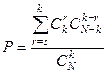 В лотерее типа спортлото имеется видов спорта. Участник лотереи называет видов спорта. Если при этом окажется, что не менее видов спорта совпадает с выборкой из видов спорта, отмеченными ранее, но неизвестными участнику, то участник лотерей выигрывает. Какова вероятность выигрыша? В обычной лотерее , , .