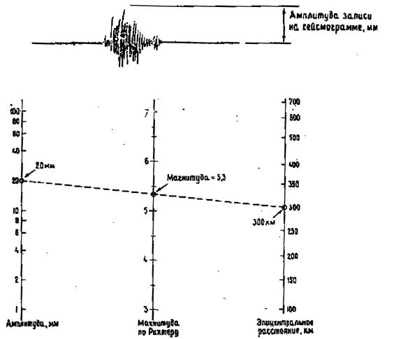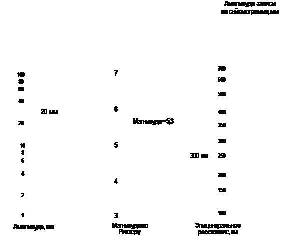 Рис. 24. Номограмма для определения магнитуды Рихтера Для того чтобы определить магнитуду Рихтера, вначале следует определитьэпицентральное расстояние этого землетрясения (например, 300 км). Далее необходимо действовать следующим образом: 1) измерить амплитуду на сейсмограмме (например, 20 мм); 2) провести прямую линию, соединяющую значения амплитуды и эпицен-трального расстояния; 3) значение магнитуды будет на средней шкале (в нашем случае – 5,3). Примечание. Эта номограмма построена для определенной сейсмической станции;накаждой станции используется своя номограмма. Поскольку шкала магнитуды логарифмическая, увеличение магнитуды на единицу означает десятикратное возрастание амплитуды смещения грунта. Нулевая магнитуда не означает, что землетрясения нет, т.к. нуль – это логарифм единицы. Это землетрясение, хотя и очень слабое, совершенно неощутимое для людей. Если магнитуда равна 1, это означает, что амплитуда равна 0,1 мкм. Для получения по магнитуде (м) величины энергии (Е), эрг, можно воспользоваться следующим соотношением: lg Е = 9,9 +1,9 м – 0,024 м 2; 1 Дж = 107эрг. На Земле еще не было зарегистрировано землетрясения с магнитудой 9, что соответствует энергии в 1018 джоулей. Интенсивность проявления землетрясения на поверхности Земли (сила землетрясения) – это мера величины состояния грунта, и определяется она степенью разрушения зданий, характером изменений поверхности по субъективным ощущениям людей. Интенсивность максимального расчетного землетрясения (МРЗ) оценивается по международной сейсмической шкале Медведева-Шпонхойера-Карника (МSК-64), имеющей 12 условных градаций – баллов. Интенсивность землетрясения зависит от магнитуды и глубины гипоцентра: чем больше магнитуда, тем интенсивность больше; чем глубже гипоцентр – тем слабее. Так, например, при глубине гипоцентра 10 км магнитуде 6 соответствует интенсивность 7 баллов, магнитуде 8 соответствует интенсивность 11…12 баллов.
