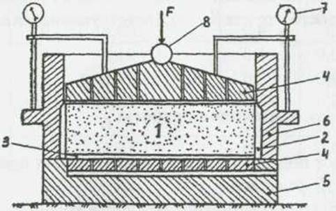 Рисунок. 1-образец грунта, 2-резиновая оболочка, 3- жидкость (глицерин – т.к меньше сжимается), 4-исток для создания давления (вертикального), 5-монометр давления жидкости, 6-монометр для измерения поровой воды, 7-герметичный корпус прибора. Последовательность испытаний:1. на образец грунта подается боковое давление, при этом образец испытывает напряжение (давление с разных сторон).2.Ступенями подается вертикальная осевая нагрузка, до разрушения образца σ=P/S. 3.На образец грунта подается горизонтально. Нагрузка больше чем в первый раз. 4. Ступенями прикладывается вертикальная нагрузка до разрушения образца больше чем в первый раз. По рез-м испытания строятся график. График. Круги получаются т.к действие касательного напряжения. Из графика определят угол внутреннего. трения (φ), удельное сцепление (С).
