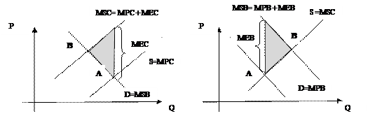 Рис. 7. Отрицательный внешний эффект Рис.8 Положительный внешний эффект Количественное и подушевое измерение объема национального продукта не отражает изменений в составе и распределении продукции, оказывающих значительное воздействие на благосостояние. Уменьшение влияния внешних отрицательных экстерналий в условиях рыночной экономики осуществляется государством посредством прямого и косвенного вмешательства. Государство в рыночном хозяйстве может повлиять на частоту и качество использования факторов производства, то есть экономическая деятельность частного сектора носит добровольный характер, а в государственном – обязательный. В связи с этим частный сектор вынужден платить государству налоги, а государство способно проконтролировать, какие виды налогов используются и на каком уровне, на какие цели и на финансирование каких программ расходуются налоговые поступления. Внешние эффекты показывают разность между социальными издержками (выгодами) и частными издержками (выгодами). MSС= MPС + МЕС где MSС – предельные общественные издержки MPС – предельные частные издержки МЕС – предельные внешние издержки. Отрицательный внешний эффект возникает в случае, если деятельность одного экономического агента вызывает издержки других. При наличии отрицательного внешнего эффекта экономическое благо продается, то есть имеет место перепроизводство товаров и услуг с отрицательными внешними эффектами. Положительный внешний эффект возникает в случае, если деятельность одного экономического агента приносит выгоды другим. При наличии положительного внешнего эффекта экономическое благо продается и покупается в меньшем по сравнению с эффективным объеме, то есть имеет место недопроизводство товаров и услуг с положительными внешними эффектами. Для того, чтобы сократить перепроизводство товаров и услуг с отрицательными внешними эффектами и восполнить недопроизводство товаров и услуг с положительными внешними эффектами, необходимо трансформировать внешние эффекты во внутренние. Трансформация внешних эффектов во внутренние может быть достигнута путем приближения предельных частных издержек (и соответственно выгод) к предельным социальным издержкам (выгодам). А.С.Пигу в качестве решения данной проблемы предложил использовать корректирующие налоги и субсидии. Корректирующий налог – это налог на выпуск экономических благ, характеризующихся отрицательными внешними эффектами, которые повышает предельные частные издержки до уровня предельных общественных. На рисунке 7 налог, равный предельным внешним издержкам Т=MЕС, мог бы приблизить рыночное равновесие к эффективному: MSВ= MSС. Корректирующая субсидия – это субсидия производителям или потребителям экономических благ, характеризующихся положительными внешними эффектами, которая позволяет приблизить предельные частные выгоды к предельным общественным. В случае с ситуацией на рисунке 8, корректирующая субсидия, равная предельным внешним выгодам - S = MЕВ, могла быть предоставлена потребителям, что повысило бы их спрос на услуги до уровня, при котором MSВ= MSС. Корректирующие налоги и субсидии не могут решить полностью проблемы, возникающие благодаря существованию внешних эффектов. Во-первых, в реальной практике довольно трудно точно исчислить предельные издержки и вы