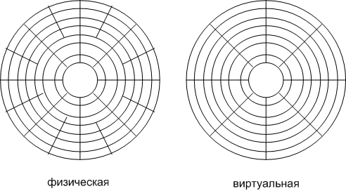 Физическая и виртуальная геометрия диска На внешних дорожках число секторов делают больше, а на внутренних меньше. На реальных дисках таких зон может быть несколько десятков.