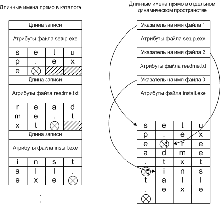 · Просто выделить место под длинные имена, увеличив записи каталога. Но это займет много места, большинство имен все же меньше 255.