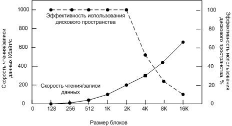 Скорости чтения/записи и эффективность использования диска, в системе с файла одинакового размера 2 Кбайта.