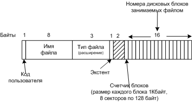 Видно, что максимальный размер файла 16Кбайт (16*1Кбайт). Для файлов размером от 16 до 32 Кбайт можно использовать две записи. Для до 48 Кбайт три записи и т.д. Порядковый номер записи хранится в поле экстент. Код пользователя - каждый пользователь мог работать только со своими файлами. Порядок чтения файлов: 1. Файл открывается системным вызовом open 2. Читается каталоговая запись, из которой получает информацию о всех блоках. 3. Вызывается системный вызов read