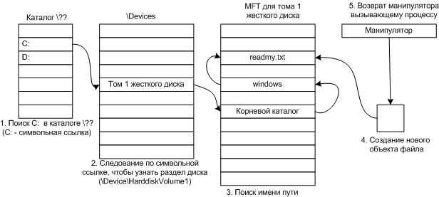 Сжатие файловПоиск файла по имени При создании файла, программа обращается к библиотечной процедуре CreateFile("C:\windows\readmy.txt",...) Этот вызов попадает в совместно используемую библиотеку уровня пользователя kernel32.dll, где \??\ помещается перед именем файла, и получается строка: \??\C:\windows\readmy.txt Это имя пути передается системному вызову NtFileCreate в качестве параметра.
