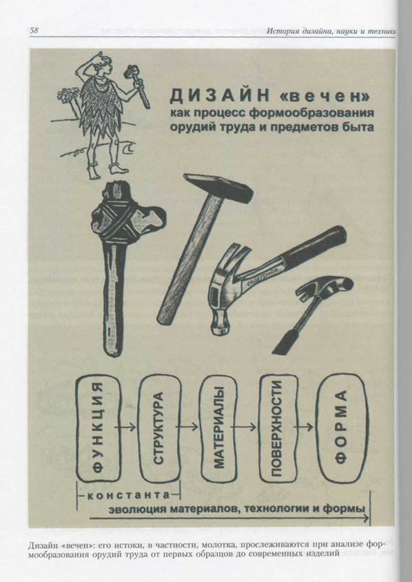 Еще одним ведущим методом дизайна признается метод компромисса, метод согласования и приведения к единству, целостности и гармонии многих противоречивых свойств, возможностей, приемов, правил [3.1]. Так как творческое преобразовательное отношение генетически заложено в человеке современном, то истоки дизайна закономерно усматривать в появлении первых орудий. Образно говоря, дизайн «вечен» как процесс формообразования орудий труда, предметов быта, когда фундаментальная цель — сделать объект деятельности полезным, удобным для пользования и даже красивым. Последнее качество — красота — стало придаваться предметам, вероятно, на грани позднего палеолита (древний каменный век — примерно до 10 тысячелетия до н.э.) и неолита (новый каменный век — около 8—3 тыс. лет до н.э.). Орнаментом стали украшать, прежде всего, керамические сосуды и одежду. Какое первоначальное значение имел орнамент, нес ли он магическое значение или своеобразно графически отражал ритм всей жизни, труда — в принципе не столь важно. Главное, что предметам в дополнение к утилитарной компоновке начали придавать некую духовную функцию. Все многообразие предметного мира условно может быть подразделено на два типа. Первый тип — те изделия, которые существовали испокон веков. В основном они служили и сегодня служат для удовлетворения извечных потребностей человека; их функция не изменилась или почти не изменилась за многие тысячелетия (ручной инструмент, посуда, мебель, одежда и т.д.). Второй тип — те, что возникли в результате изобретений и научных открытий. Чаще всего им присущи совершенно новые (средства связи, бытовая техника, новые транспортные средства и т.д.) или ранее выполнявшиеся на примитивном уровне функции. Любое творение человеческих рук для практических целей можно охарактеризовать рядом свойств. Наиболее важное свойство утилитарного изделия — его основная функция. Другими желательными свойствами являются удобство, безопасность и эстетическое совершенство. Все эти свойства должны в итоге составлять единое целое, обеспечивая двуединство пользы и красоты. Довольно полно охарактеризовать изделие позволяют пять материальных свойств: структура (т.е. элементы изделия и их взаимозависимость — компоновка); форма; материалы; размеры; поверхности (для всего изделия и отдельных элементов). Составные орудия труда (топоры, молотки, мотыги и др.) — одни из широко распространенных изделий отмеченного выше первого типа. Функция и струк- 50 История дизайна, науки и тем