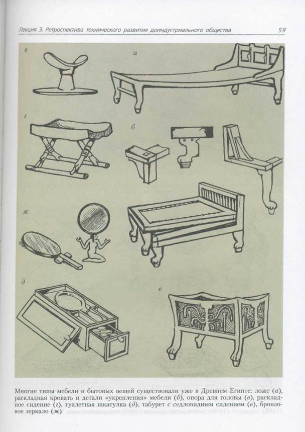 Дизайн, его история неразрывно связаны с развитием вещественного напо| нения среды жизнедеятельности, историей науки и техники. В рамках дисци^ лины «История культуры и искусства» достаточно полно изучается эволюцж предметного мира от первобытного общества до XXI века; освещаются особи ности региональных культур, их взаимосвязь с социально-экономическими «ловиями, зависимость от научно-технических достижений и пр. Мы же тольм отметим наиболее характерные, основополагающие для понимания эволюцщ материальной культуры открытия, изобретения, события и факты. Замечательным событием было изобретение в мезолите (средний каменны век — около 10—5 тыс. лет до н.э.) лука и стрел. Они не только оставались новным видом оружия вплоть до XVII века; с помощью лука сверлили, на ег| основе делали музыкальные инструменты. Величайшим изобретением стало изобретение колеса и изготовление повозок (около 4 тыс. лет до н.э.). Показательно, что они появились при переходе от коче[ вого образа жизни к оседлому. Человек стал засевать поля, разводить скот, стр ить большие поселения; началась торговля зерном, камнем, лесом и пр. Возник необходимость перемещать значительные тяжести на большие расстояния. Со менем колесо легло в основу гончарного круга, мельницы, водяного колеса. Посуда из глины и первые изделия из меди появились еще в 8 тысячелетии! до н.э. Сначала занимались «холодной» ковкой меди из медного колчедана, позд) нее медь стали выплавлять. 4 тыс. лет до н.э. — изобретение папируса, начало производства хлопчатобу-1 мажных тканей в Индии, Китае, Египте. Около 3 тыс. лет до н.э. наступил брон! зовый период, время, когда обрабатывали также серебро и золото, когда нача| лось производство железа (Армения). Многие из окружающих нас бытовых вещей существовали уже в Древнем! Египте за 2 тыс. лет до,н.э. Их облик менялся очень постепенно, т.к. изготовите! ли-ремесленники были подвластны традициям. Мастерство передавалось из по! коления в поколение, вместе с ним наследовались и основа формы, и конструкция, и технология изготовления, которые были канонизированы. При всем многообразии предметного мира Древнего Египта можно отметить! его характерные признаки. Это, прежде всего, достаточно высокая утилитарная! функциональность и целесообразность бытовых предметов. Далее, как и в архитектуре, целостность и органичность, мягкость очертаний, неощутимый переход скульптуры в конструкцию и конструкции в скульптуру. Углы сглаживаются, прямым линиям придаются изгибы, кривизна. Изобразительная скульптура часто входит в форму предмета. Внешнее пластическое (осязательное и визуальное) I отношение к предмету сильнее конструктивного, хотя все изменения из-за еле-1 дования канонам растягивались во времени на столетия и тысячелетия.