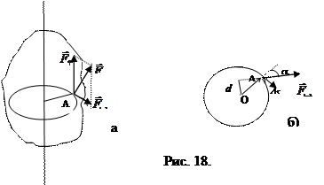 1. Тело может вращаться вокруг неподвижной оси. В точке А (рис.18 - а) к нему приложена сила M = F^d (4.3.1) Заметим, что при вращательном движении тела мерой внешнего воздействия на него служит момент силы. 2. Формула работы при вращении тела под действием момента силы из начального положения с угловой координатой j1 в конечное положение с угловой координатой j2 принимает вид:
