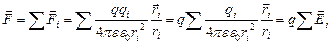 Вектор напряженности электростатического поля точечного заряда направлен вдоль прямой, соединяющей точку, где находится заряд, с данной точкой поля. Он выходит из точки поля и направлен от заряда, если он положительный, и к заряду, если он отрицательный. Величина напряженности E= Пусть имеется система точечных зарядов qi (i= 1, 2, …). Поместим в некоторую точку системы, положение которой относительно каждого ее заряда указывает вектор