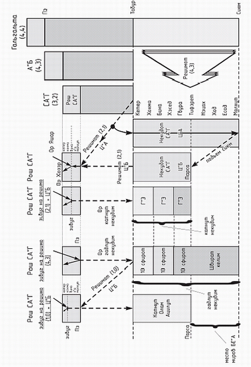 Рис. 4 Парцуф некудот де-Са”Г создал под табуром такое понятие, как место. Что такое место? Это такая сфира, в которой может существовать другая сфира, меньше первой по измерению. Наш мир существует на каком-то месте. Если выкачать из него абсолютно все, всю вселенную, то останется место. Мы этого ощутить не можем. Это просто пустота, которую невозможно измерить, она — в других измерениях. Вместе с нашим миром существуют и духовные миры, все миры сквозные, поэтому их невозможно увидеть, ощутить, т.к. они тоже находятся в других измерениях. На месте Га”Р де-бина под табуром появится в дальнейшем мир Ацилут. Под парсой в нижней части тиферет образуется мир Брия. На месте сфирот нецах, ход, есод возникнет мир Ецира. А на сфире малхут — мир Асия, последняя часть которого называется «этот мир». Как произошли из 5-ти сфирот 10? Кетер, хохма, бина, з”а и малхут: каждая из этих сфирот, кроме з”а, состоит из 10 сфирот. З”А, как маленькое лицо, состоит только из 6-ти сфирот: хесед, гвура, тиферет, нецах, ход, есод. Если вместо з”а подставить его 6 сфирот, то вместе с кетер, хохма, бина и малхут они составят 10. Поэтому иногда мы называем 5 сфирот, иногда — 10. Но нет парцуфа, состоящего из 12 или 9 сфирот. Термины Каббалы не нужно переводить на русский язык. Все они обозначают либо какой-то духовный парцуф, либо его часть. Перевод же может способствовать созданию какого-то образа нашего мира, что строго запрещено. Нельзя низводить духовное до материального. Слова голова, рот, тело, а затем мы познакомимся еще и с такими терминами, как поцелуй, объятие, совокупление и др., могут вызвать в нас ассоциации, не связанные с Каббалой. Я рекомендую сразу запоминать ивритские наименования. У русскоговорящих есть преимущество в этом перед израильтянами: поначалу из-за незнания иврита у них ивритские термины не создают внутреннего видения образов нашего мира.