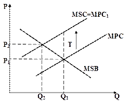 В нашем примере с целлюлозно-бумажным комбинатом налог, равный предельным внешним издержкам Т=МЕC, мог бы приблизить рыночное равновесие к эффективному: MSB=MSC. Действительно, для предприятия налог – это дополнительные издержки, поэтому МРС1 поднимется на Т рублей вверх и совпадет с кривой MSC (см. рис. 10.4.).