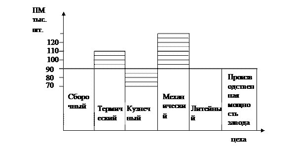 Из диаграммы видно, что на заводе имеются свободные производственные мощности в термическом и механическом цехах и «узкое место» (т.е. не хватает мощностей) – кузнечный цех. Для того, чтобы загрузить свободные мощности, можно увеличить объем кооперированных поставок. Для расширения «узких мест» необходимо предусмотреть организационно-технические мероприятия: установку дополнительного оборудования, модернизацию действующего, переход на трехсменный режим работы, приобретение оборудования на условиях лизинга.