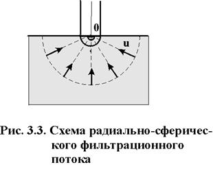 3. Радиально-сферический поток. Траектории всех частиц жидкости - прямолинейные горизонтальные прямые, радиально сходящиеся к центру полусферического забоя; изотахи и эквипотенциальные поверхности перпендикулярны траекториям и образуют сферические поверхности. Скорость фильтрации в любой точке потока является функцией только расстояния этой точки от центра забоя. Следовательно, этот вид фильтрационного потока также является одномерным.