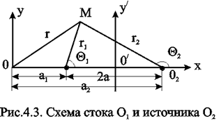 Пусть сток О1 и источник О2 равнодебитны, т.е. имеют одинаковые по модулю массовые дебиты G. Расстояние между источником и стоком равно 2а. Исследуем поток от источника к стоку. Проведём ось 0 х через точки О1 и О2 таким образом, чтобы точка О1 находилась от начала координат 0 на расстоянии а1, а точка О2 на расстоянии а2 (рис. 4.3).