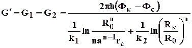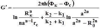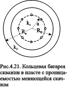 Пусть в круге радиуса R0 проницаемость k 1, а в кольце Rк проницаемость k2. При этом Rк>>a, радиуса батареи. Поток к n эксплуатационным скважинам идёт от окружности радиуса R0 и дебит G1 каждой скважины определяется по (4.25), где вместо jк следует поставить j0 - потенциал на границе двух сред, а вместо Rк - R0. Во второй области поток плоскорадиален от контура Rк до укрупненной скважины радиуса R0 и дебит скважины
