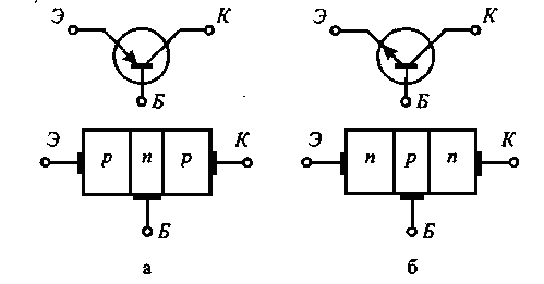 Рис. 8.6. Структура биполярного транзистора типов и их условное обозначение Биполярный транзистор (БТ) представляет собой трехслойную структуру (рис. 8.6). В зависимости от способа чередования слоев БТ называются транзисторами типа Транзистор называется биполярным, если физические процессы в нем связаны с движением носителей обоих знаков (свободных электронов и дырок). В биполярном транзисторе средний слой называется базой (Б), один крайний слой – коллектором (К), а другой крайний слой – эмиттером (Э). Каждый слой имеет свой вывод, с помощью которых биполярный транзистор подключается в цепь. Структура и условное обозначение одного из видов полевых транзисторов показана на рисунке 8.7. У полевых транзисторов так же, как и у биполярных, – три электрода, называемые истоком, стоком и затвором. Истоком (И) называется электрод, из которого в центральную область ПТ (канал) входят основные носители заряда п- или р -типов. Сток (С) – электрод, через который основные носители уходят из канала. Затвор (З) – электрод, управляющий потоком носителей заряда. Поскольку в полевом транзисторе ток определяется движением носителей только одного знака р- или п -типов, эти транзисторы называют также униполярными.
