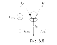 Схема простейшего усилительного каскада на транзисторе, включенном по схеме ОБ, приведена на рис. 3.5. По сравнению со схемой, приведенной на рис. 3.4, в эмиттерную цепь введен источник переменного напряжения uЭБ-, а в коллекторную цепь включен нагрузочный резистор RК. Переменное напряжение uЭБ- наряду с напряжением, подаваемым от источника питания, воздействует на сквозной поток электронов, движущихся из эмиттера в коллектор. В результате этого воздействия коллекторный ток приобретает переменную составляющую iК–, которая благодаря очень высокой эффективности управления может быть значительной даже при очень маленькой величине uЭБ-. При протекании тока коллектора через нагрузочный резистор на нем выделяется напряжение, также имеющее переменную составляющую uКБ- = iК– RК. Это выходное переменное напряжение при достаточно большом сопротивлении RК может значительно превосходить величину входного переменного напряжения uЭБ- (uКБ- >>uЭБ-). Таким образом, транзистор, включенный по схеме ОБ, усиливает электрические сигналы по напряжению. Что касается усиления по току, то рассмотренная схема его не обеспечивает, поскольку входной и выходной токи примерно равны друг другу (iЭ» iК).