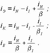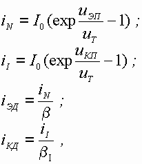 Модель базируется на эквивалентной схеме, приведенной на рис. 3.14. Расчетные формулы, полученные ранее, (см. 3.8, 3.9, 3.17, 3.18) объединим в систему : причем uЭП= - uЭБ, uКП = - uКБ. Токи во внешних цепях транзистора рассчитываются по формулам:
