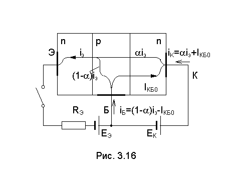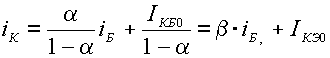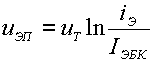 Таким образом, при iЭ =0, iК= IКБ0. Если теперь замкнуть цепь эмиттера, то появится ток iЭ=EЭ/RЭ (задаваемый внешней цепью). Ток эмиттера будет передаваться в коллектор с коэффициентом a. В результате получим: iК =a iЭ+IКБ0. (3.24) Напряжение на эмиттерном переходе можно вычислить с помощью (3.21). Пренебрегая малыми тепловыми токами, получаем: