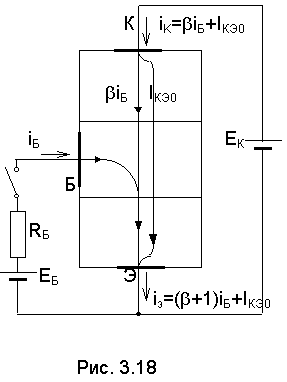 Для включения с ОЭ (рис.3.18) в качестве входного тока рассматривается ток базы. Учитывая что iЭ= iК+iБ, исключим ток iЭ из выражения (3.24) iК =a (iК+iБ)+IКБО, тогда IКЭ0 » b I КБ0 - называется сквозным тепловым током транзистора. Это ток между эмиттером и коллектором при оборванном выводе базы. Для вычисления напряжения на эмиттерном переходе используем (3.25). Считая, что iБ» (1- a iЭ), получим: