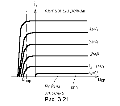 Семейство выходных характеристик n-p-n-транзистора приведена на рис. 3.21. Выражение дляидеализированной выходной характеристики в активном режиме имеет вид: iК =a · iЭ+ IКБ0. (3.36)