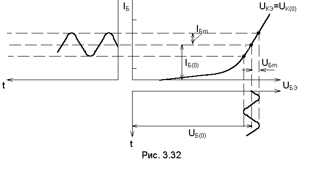 и рабочая точка будет перемещаться по нагрузочной линии между точками B и C. Соответственно будет изменяться ток коллектора с амплитудой IКm около значения IК (0) и напряжение на коллекторе с амплитудой UКm около значения UКЭ (0). При этом ток коллектора iК будет находиться в фазе с током базы iБ, а выходное напряжение uКЭ в противо-фазе. (Увеличению тока базы соответствует увеличение тока коллектора и уменьшение напряжения на коллекторе. См. рис. 3.31). Для определения входного напряжения uБЭ необходимо воспользоваться входной характеристикой транзистора i=f(uБЭ) при uКЭ=UК(0) рис.3.32. (Строго говоря, при больших UКm может потребоваться семейство входных характеристик, снятых при различных uКЭ, но, как правило, влиянием uКЭ на входной ток можно пренебречь). Постоянному току IБ (0) соответствует постоянное напряжение UБ (0). При изменении тока базы с амплитудой IБm входное напряжение изменяется с амплитудой UБm . Обратим внимание на то, что выходное напряжение в данном каскаде (ОЭ) противофазно входному. Графические расчеты могут выполняться и без учета введенных ранее ограничений.
