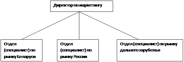 Данная схема эффективна в тех случаях, когда разные рынки обладают различными потребительскими характеристиками (нуждами, вкусами). Разновидностью данной схемы является организация по географическому принципу, который применяется тогда, когда для разных регионов есть существенные различия в транспортировки товара и построение сбытовых сетей.