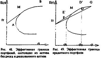 В настоящей главе рассматривается вопрос, какой из возможного набора эффективных портфелей следует выбрать инвестору. Вначале мы проанализируем эффективную границу для портфелей, состоящих из актива без риска и рискованного актива, сформулируем теорему отделения. После этого определим понятие рыночный портфель и представим эффективную границу для случая, когда процентные ставки по займам и депозитам неодинаковы. ЭФФЕКТИВНАЯ ГРАНИЦА ПОРТФЕЛЕЙ, СОСТОЯЩИХ ИЗ АКТИВА БЕЗ РИСКА И РИСКОВАННОГО АКТИВА Если вкладчик планирует инвестировать средства только в рискованный портфель, он должен выбрать один из портфелей на эффективной границе (отрезок АВ на рис. 48). Выбор конкретного портфеля зависит от предпочтений инвестора в отношении риска. В случае инвестирования части средств в актив без риска (актив rf) вкладчик должен остановиться только на одном единственном портфеле на эффективной границе, а именно, портфеле М. Его можно найти, проведя касательную от значения ставки без риска rf к эффективной границе рискованных портфелей. Инвестор выберет портфель М, так как кредитный портфель, составленный из актива rf и портфеля М, дает ему возможность получить более высокую ожидаемую доходность при том же уровне риска, что и рискованные портфели, расположенные на отрезке эффективной границе AM. Таким образом, при формировании кредитного портфеля меняется эффективная граница — из нее исключается отрезок AM, поскольку появляются новые доминирующие портфели. Эффективная граница представлена теперь линией rfМВ. В свою очередь это означает, что в случае инвестирования только в рискованные активы, вкладчик должен остановить свой выбор только на портфелях на участке MB. Если он предпочитает комбинацию из актива без риска и рискованных активов, то ему в качестве рискованного следует выбрать портфель М. Именно при таких стратегиях достигается наиболее высокий уровень ожидаемой доходности при наименьшем уровне риска. Допустим, вкладчик не следует данному правилу и формирует портфель из актива без риска (rf) и рискованного портфеля, однако в качестве последнего он выбирает не портфель М, а портфель G (см. рис. 49). Тогда все возможные сочетания ожидаемой доходности и риска будут располагаться на прямой rfG.