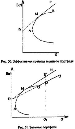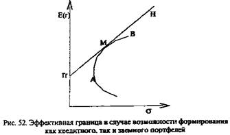 Таким образом, можно сделать вывод: если инвестор может сформировать как заемный, так и кредитный портфель, то из всех рискованных портфелей на эффективной границе он выберет только портфель М, а эффективная граница превратится в прямую линию rfН (см. рис. 52).
