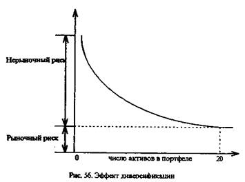 Рыночный и нерыночный риски. Эффект диверсификации Риск, с которым связано владение активом, можно разделить на две части. Первая составляющая — это рыночный риск. Его также именуют системным или недиверсифицируемым, или неспецифическим. Он связан с состоянием конъюнктуры рынка, общезначимыми событиями, например, войной, революцией. Его нельзя исключить, потому что это риск всей системы. Вторая часть — нерыночный, специфический или диверсифицируемый риск. Он связан с индивидуальными чертами конкретного актива, а не с состоянием рынка в целом. Например, владелец какой-либо акции подвергается риску потерь в связи с забастовкой на предприятии, выпустившем данную бумагу, некомпетентностью его руководства и т. п. Данный риск является диверсифицируемым, поскольку его можно свести практически к нулю с помощью диверсификации портфеля. Как показали исследования западных ученых, портфель, состоящий из хорошо подобранных 10-20 активов, способен фактически полностью исключить нерыночный риск (см. рис. 56). Широко диверсифицированный портфель заключает в себе практически только рыночный риск. Слабо диверсифицированный портфель обладает как рыночным, так и нерыночным риска-ми. Таким образом, инвестор может снизить свой риск только до уровня рыночного, если сформирует широко диверсифицированный портфель.