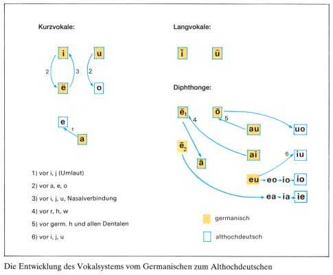 Умлаут (точнее, i-умлаут) (Umlaut) – переход краткого а в краткое е корне, если в следующем за корнем слоге i или j. Двн. ед. число gast "гость"– мн. число gesti; Развитие системы гласных от германского состояния к древневерхненемецкому