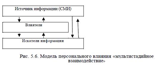 Однако инициатива информационного потока не всегда исходит от влиятельного лица. Коммуникации «из уст в уста» столь же часто инициируются получателем информации, который ищет совета знающего приятеля или знакомого. 3) Мультистадийное взаимодействие (Multistage Interaction). Интенсивные исследования диффузии инноваций оспорили модель двушагового потока. В мультистадийном взаимодействии как влиятели, так и искатели испытывают воздействие источников информации