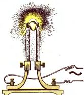 Рис. 2 Свеча Яблочкова Однако питание «свечей» постоянным током было неудобным. Уголь положительного электрода сгорал быстрее, ведь при образовании дуги анод, бомбардируемый электронами, разогревается до высоких температур. Анод делали массивным, но и это усложнение светильника не давало желаемого результата. Именно тогда, стараясь «уравнять в правах» электроды, Яблочков и предложил использовать переменный ток. Пожалуй, это решение по своей значимости было гениальным. Оно сразу позволило решить две проблемы: сделать «свечу» удобной и экономичной и во многом улучшить конструкцию генератора. Ведь становился ненужным коллектор - механическое устройство для превращения переменного тока, получаемого в любом генераторе, в постоянный. В дальнейшем это позволило поменять местами ротор и статор, что еще упростило конструкцию. Второй шаг в создании современной электропередачи был снова сделан Яблочковым и его помощником Иваном Филипповичем Усагиным. И связан он с созданием электрического трансформатора. Дуговые электрические лампы нельзя было включать в цепь параллельно. Посудите сами: ведь зажигание такого светильника - это просто-напросто короткое замыкание (рис. 3). Поэтому приходилось включать все лампы последовательно и одновременно. Яблочков вышел из этого положения с помощью индукционных катушек — бобин с двумя обмотками, то есть, на нынешнем языке говоря, трансформаторов. Их первичные обмотки включались последовательно, а к вторичным присоединялись «свечи Яблочкова». Эти бобины-трансформаторы были изготовлены Усагиным (рис. 4).