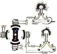 Рис. 4. Схема с трансформаторами Усагина Заметим, что бобины Усагина имели и в первичной и во вторичной обмотках одинаковое число витков. Однако, изменяя их отношение, можно было повышать или понижать напряжение на выходе. Трудно переоценить значимость этого изобретения. Трансформаторы позволяли увеличивать напряжение линий электропередачи, уменьшая при этом ток и, следовательно, потери. Так открылся путь к передаче энергии на большие расстояния. Казалось бы, все хорошо, но следующая загвоздка: не существовало надежных двигателей переменного тока. Они плохо раскручивались, при перегрузке останавливались и не могли составить конкуренции двигателям постоянного тока. Конструкторы не понимали почему так происходит?